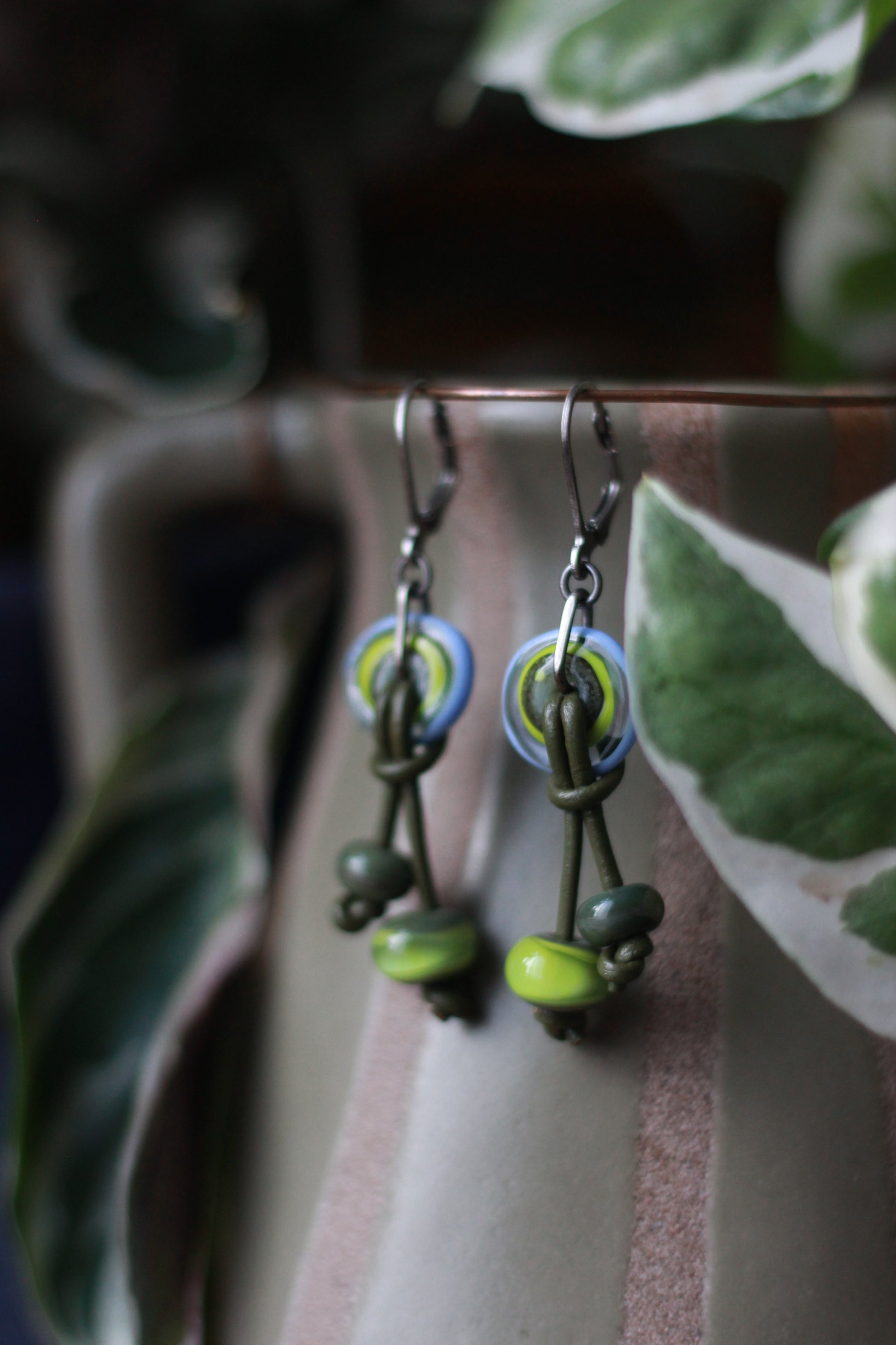 Each element has been sawed, hammered and shaped using traditional metalsmithing techniques. The glass beads are kiln hardened after production for durability.