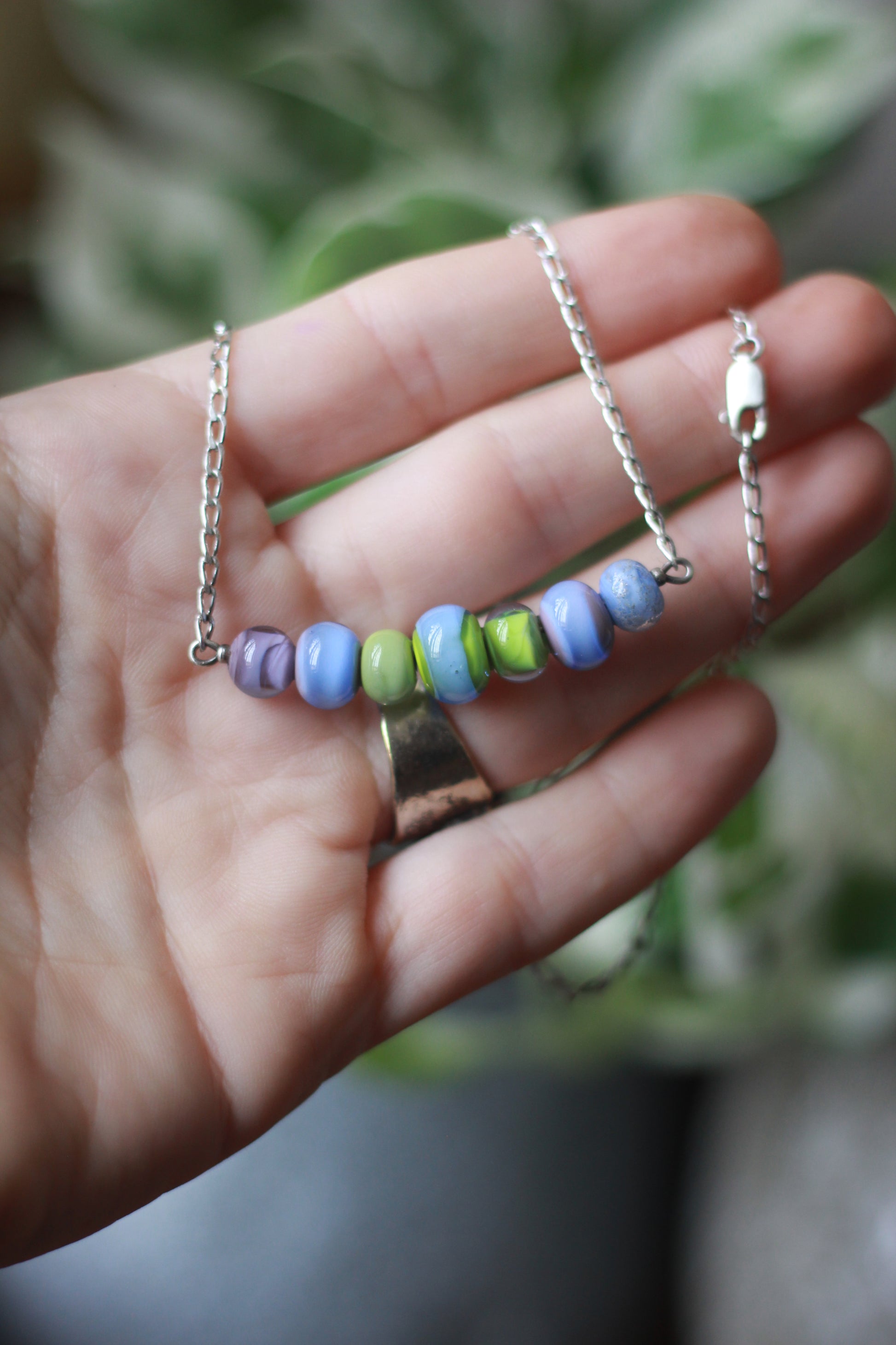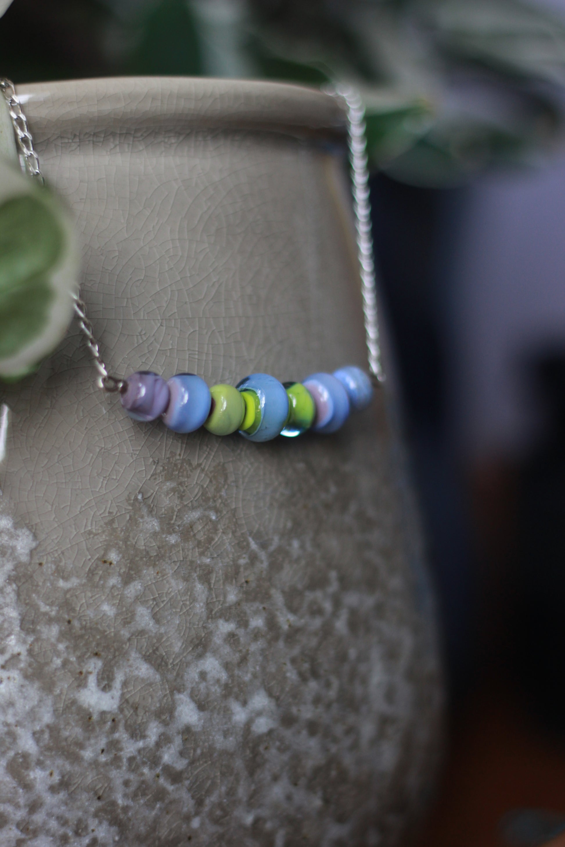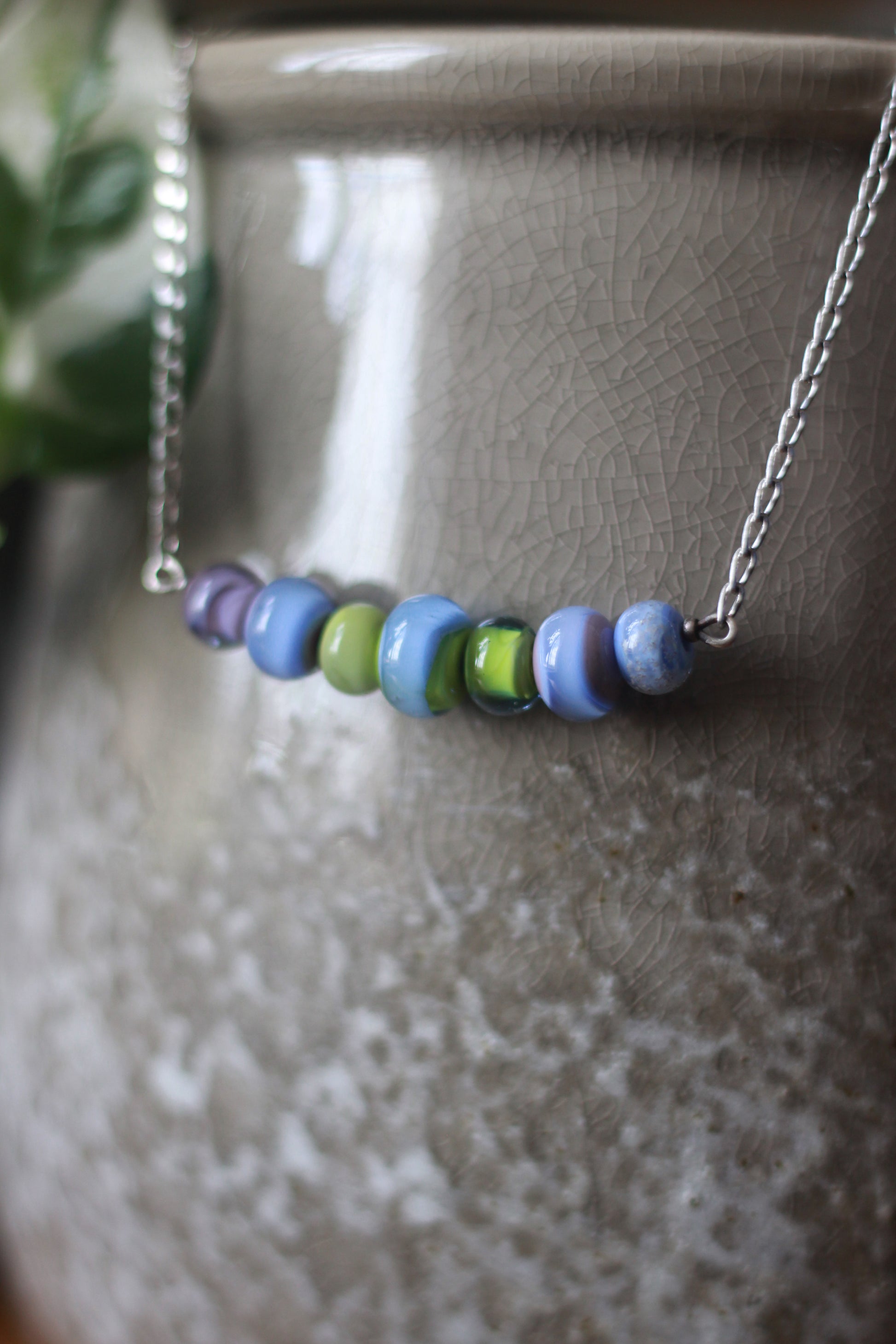 Handmade Moretti glass beads, kiln hardened for durability. All findings are Sterling silver and the chain is finished with a lobster clasp.