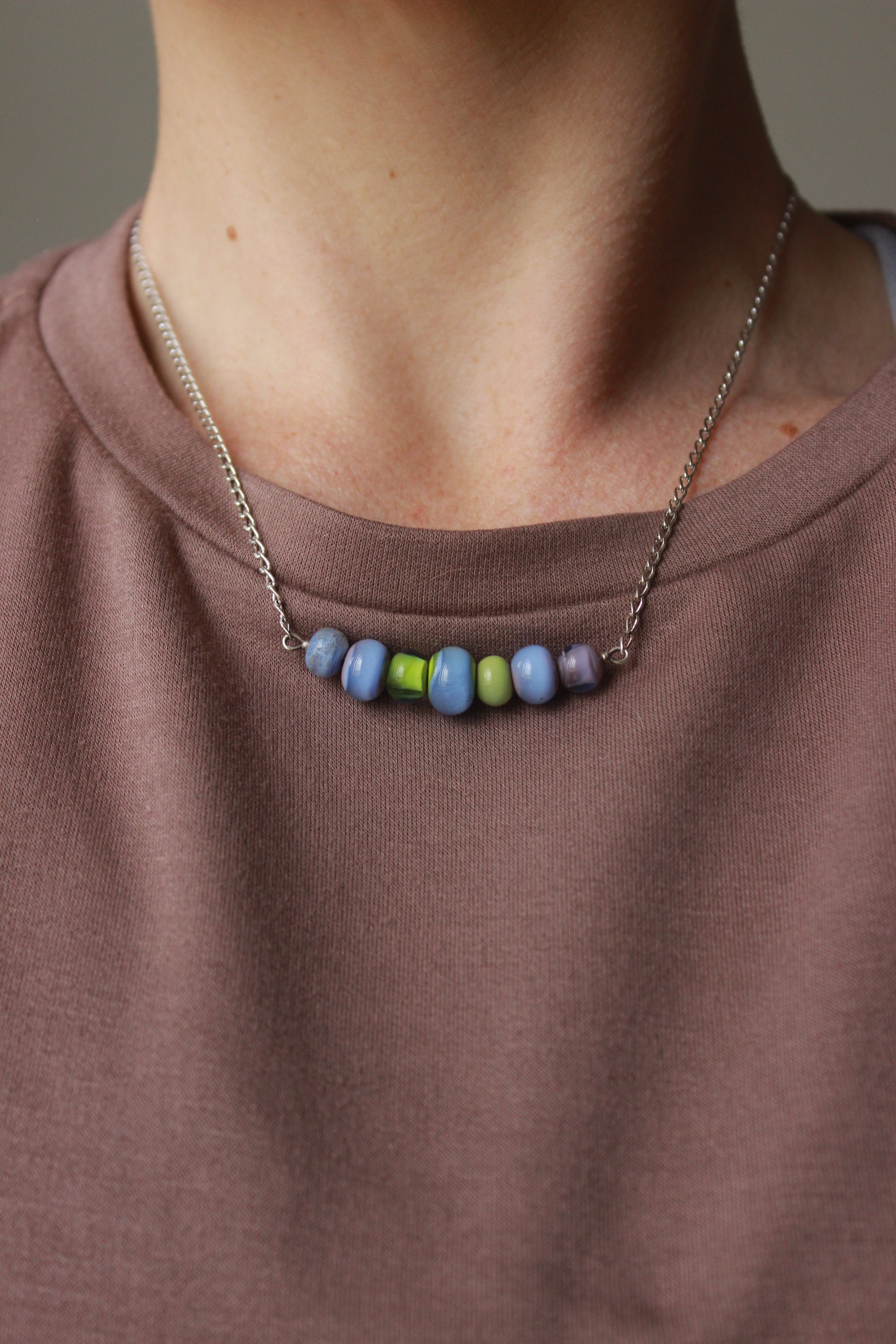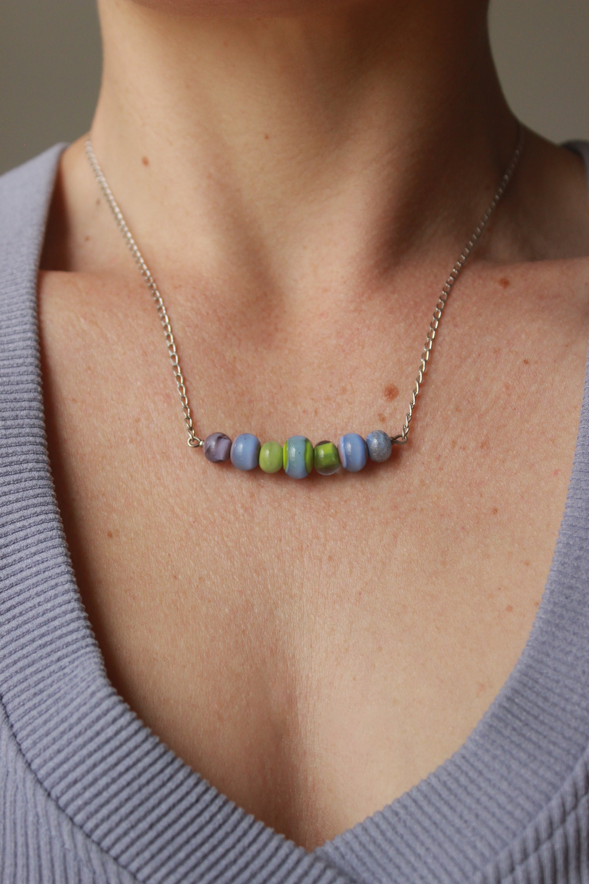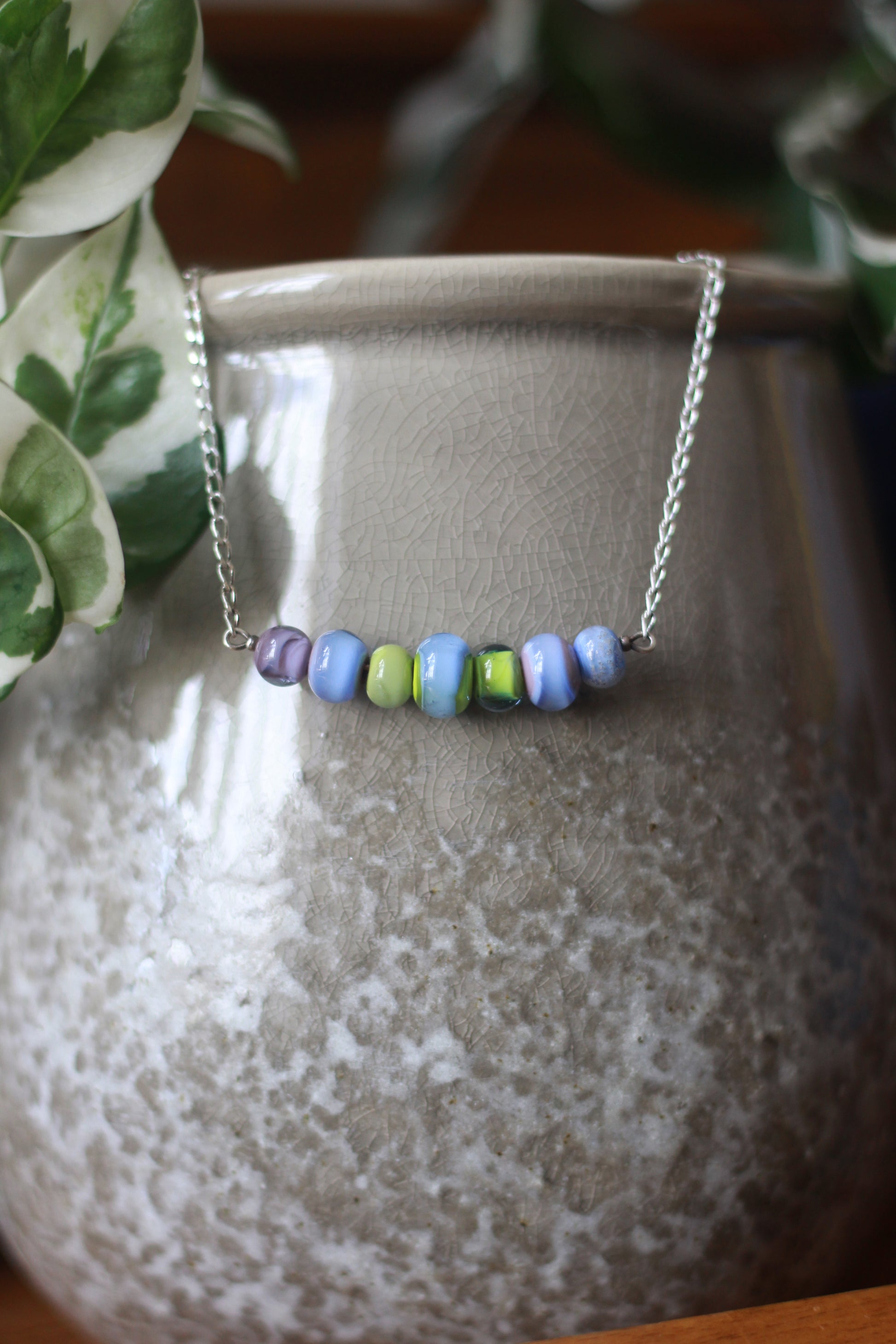Handmade Moretti glass beads, kiln hardened for durability. All findings are Sterling silver and the chain is finished with a lobster clasp.