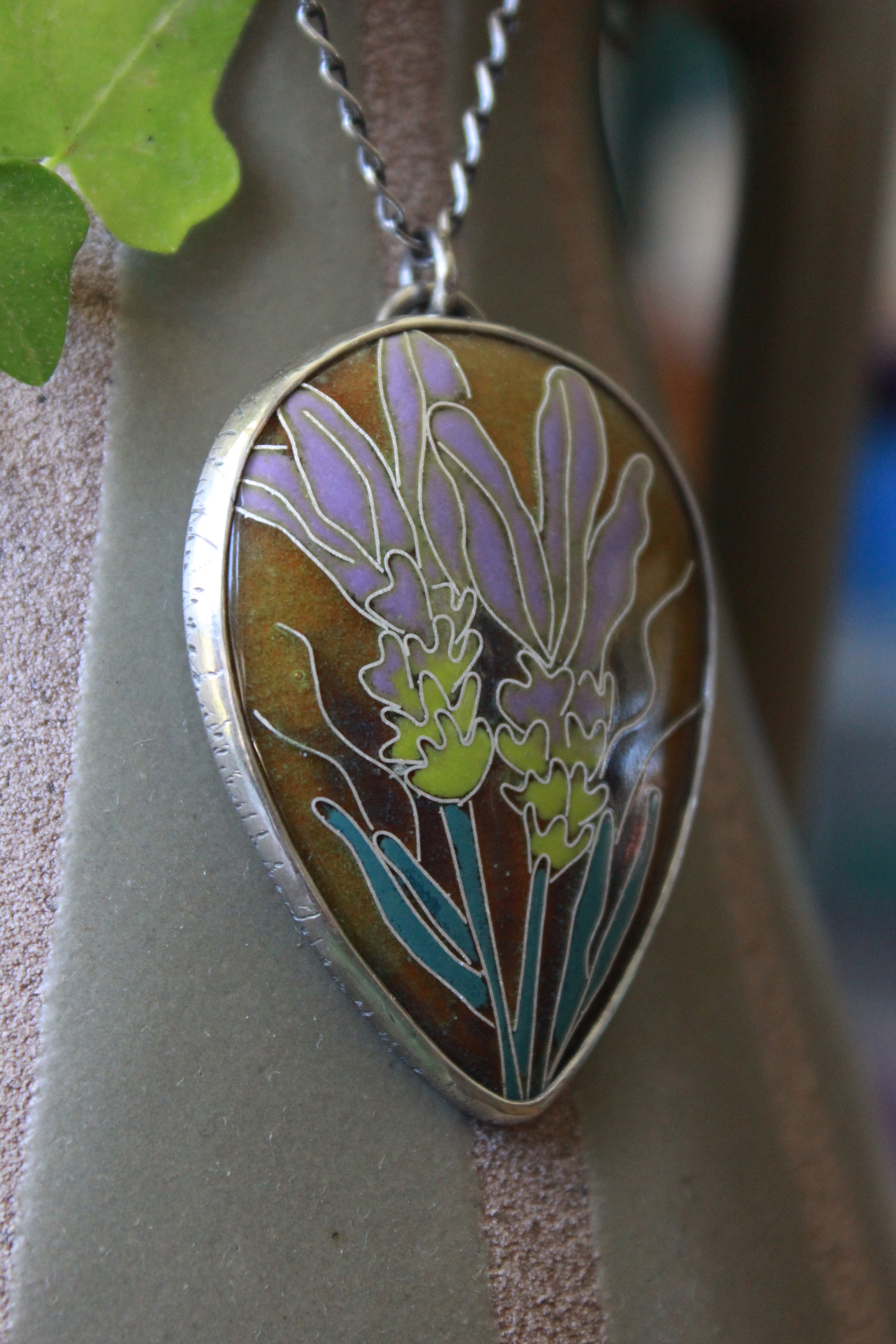The lavender design is made of fine silver wire and glass on a base of copper. The resulting pendant is set in fine and sterling silver. A lot of cloisonne is done on a base of silver over copper but I chose to keep the raw earthiness of the copper in this piece which is visable through the transparent background glass.