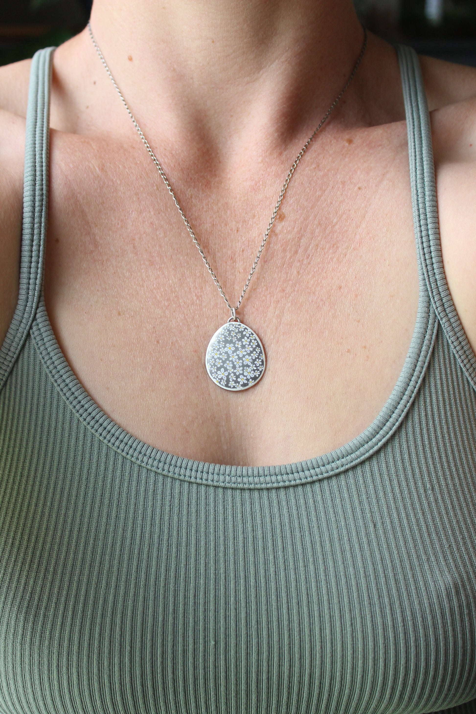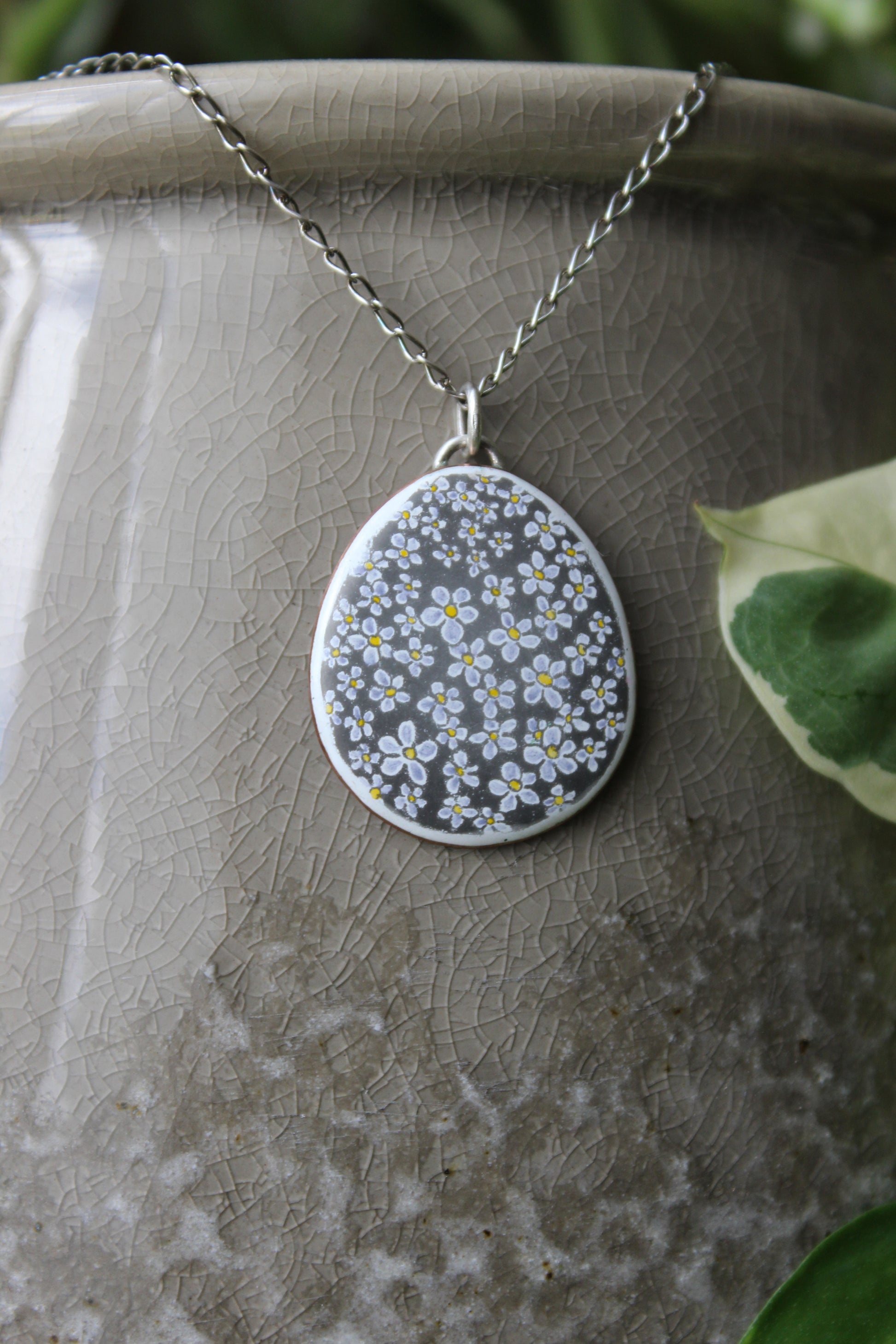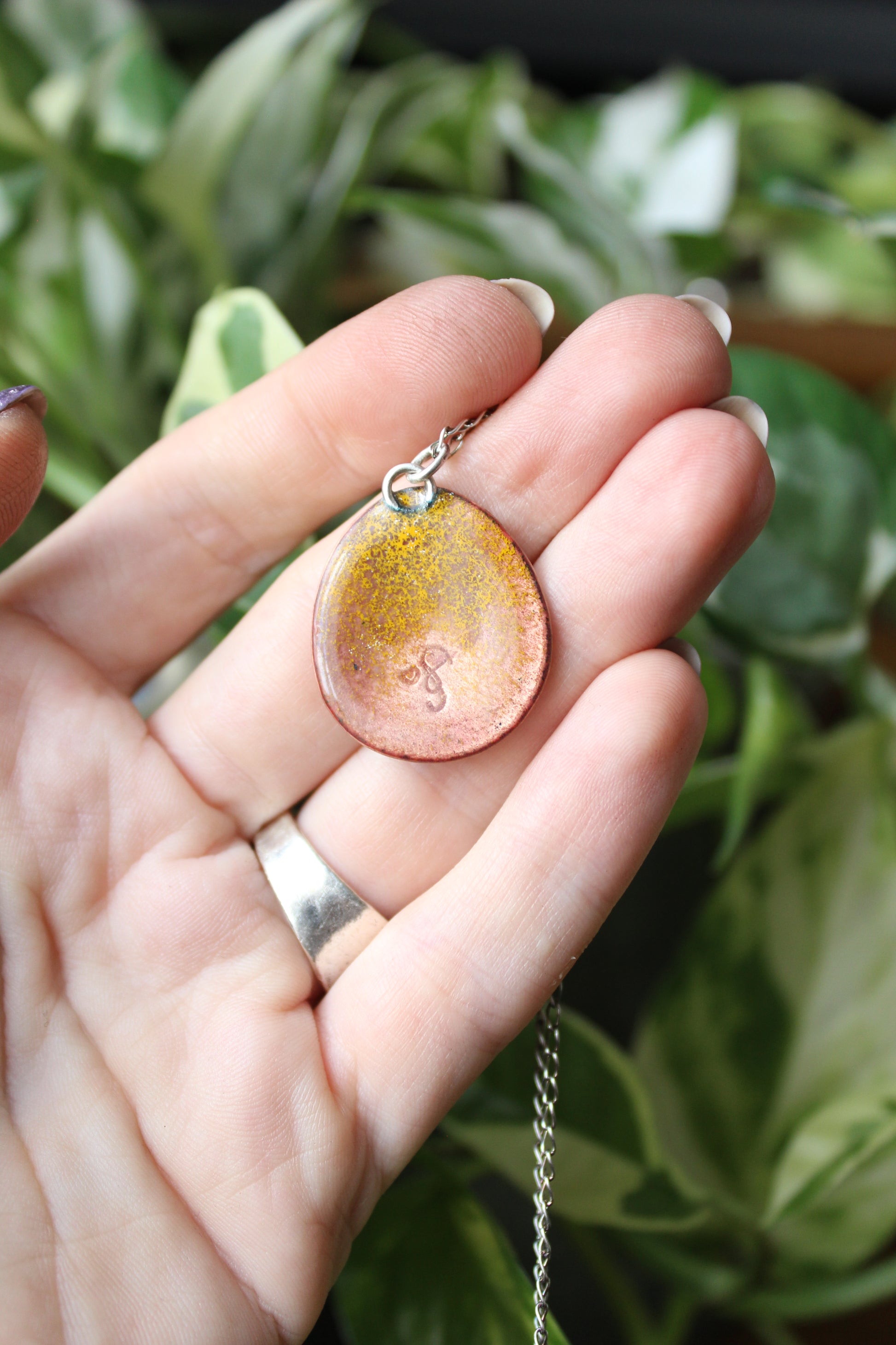 This piece is lightly domed and enamelled on both sides. Enamelling the back adds stability to the piece and means no bare copper will touch your skin.