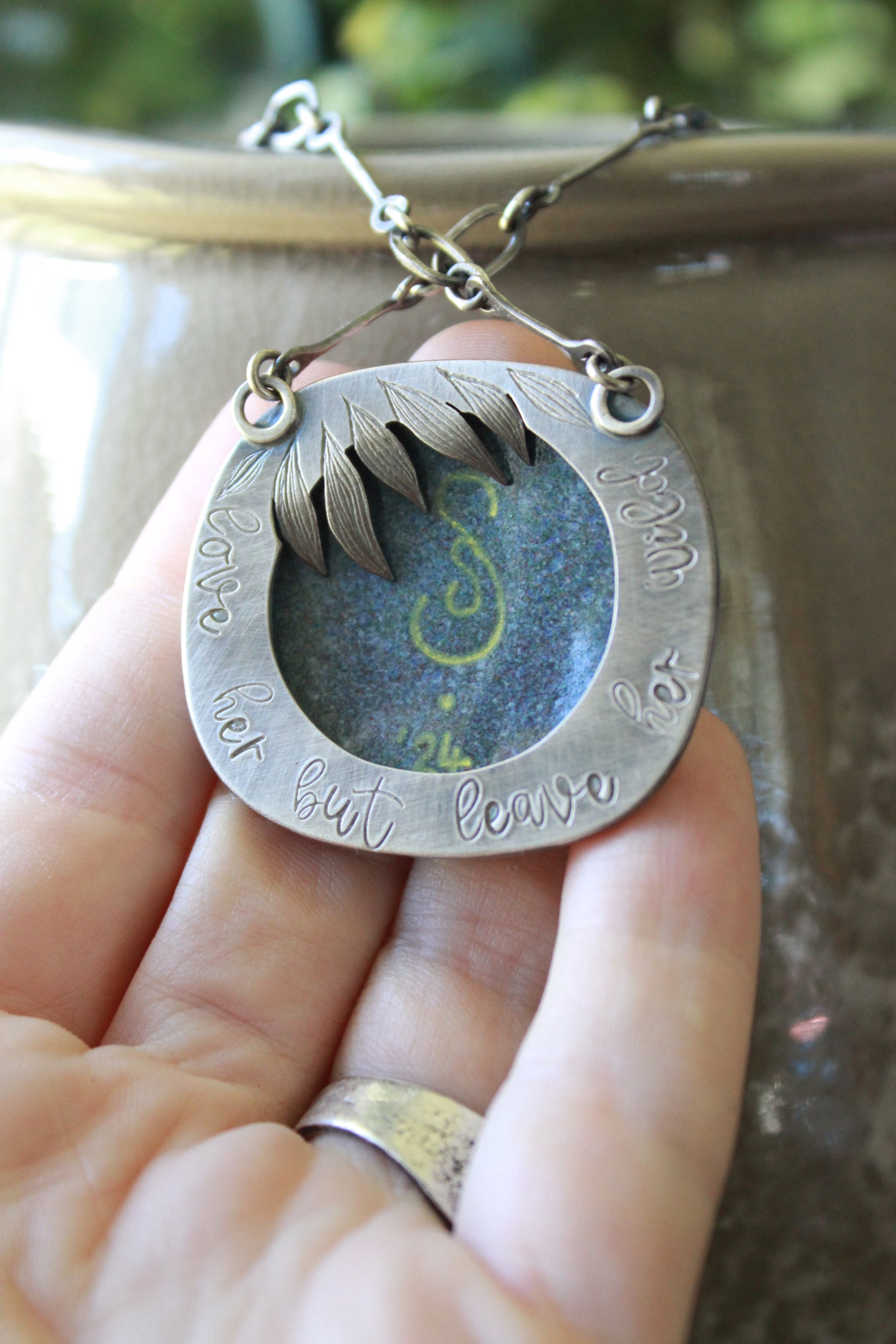 The pendant is hand painted using vitrifiable paints on a base of copper and set in fine and sterling silver. The back of this setting was stamped and carved by hand.