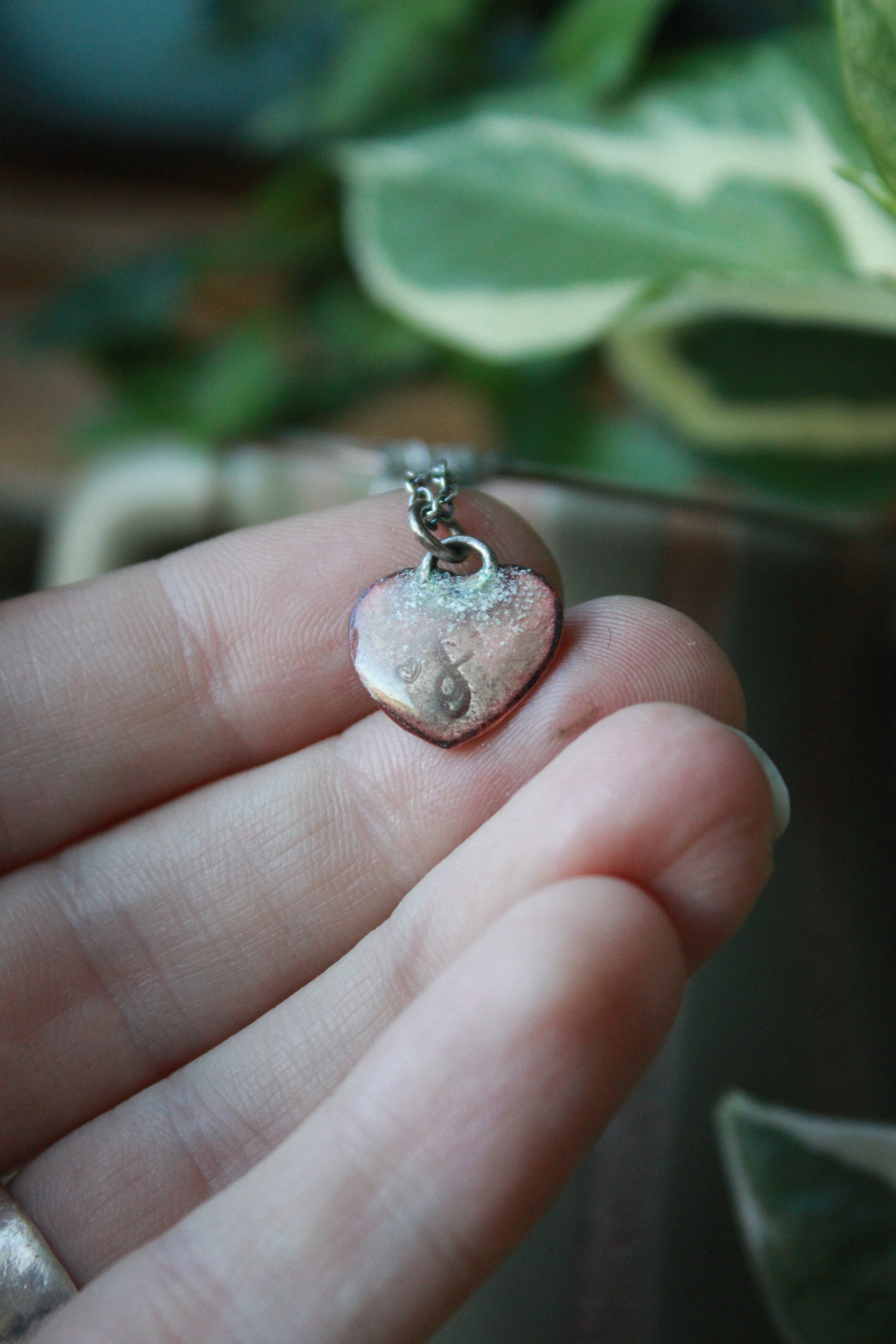This piece is lightly domed and enamelled on both sides. Enamelling the back adds stability to the piece and means no bare copper will touch your skin.