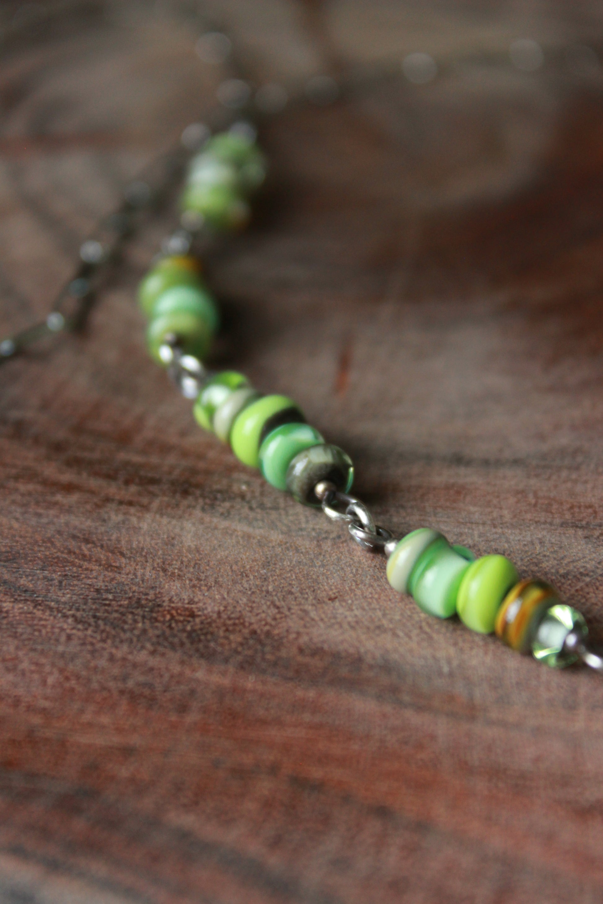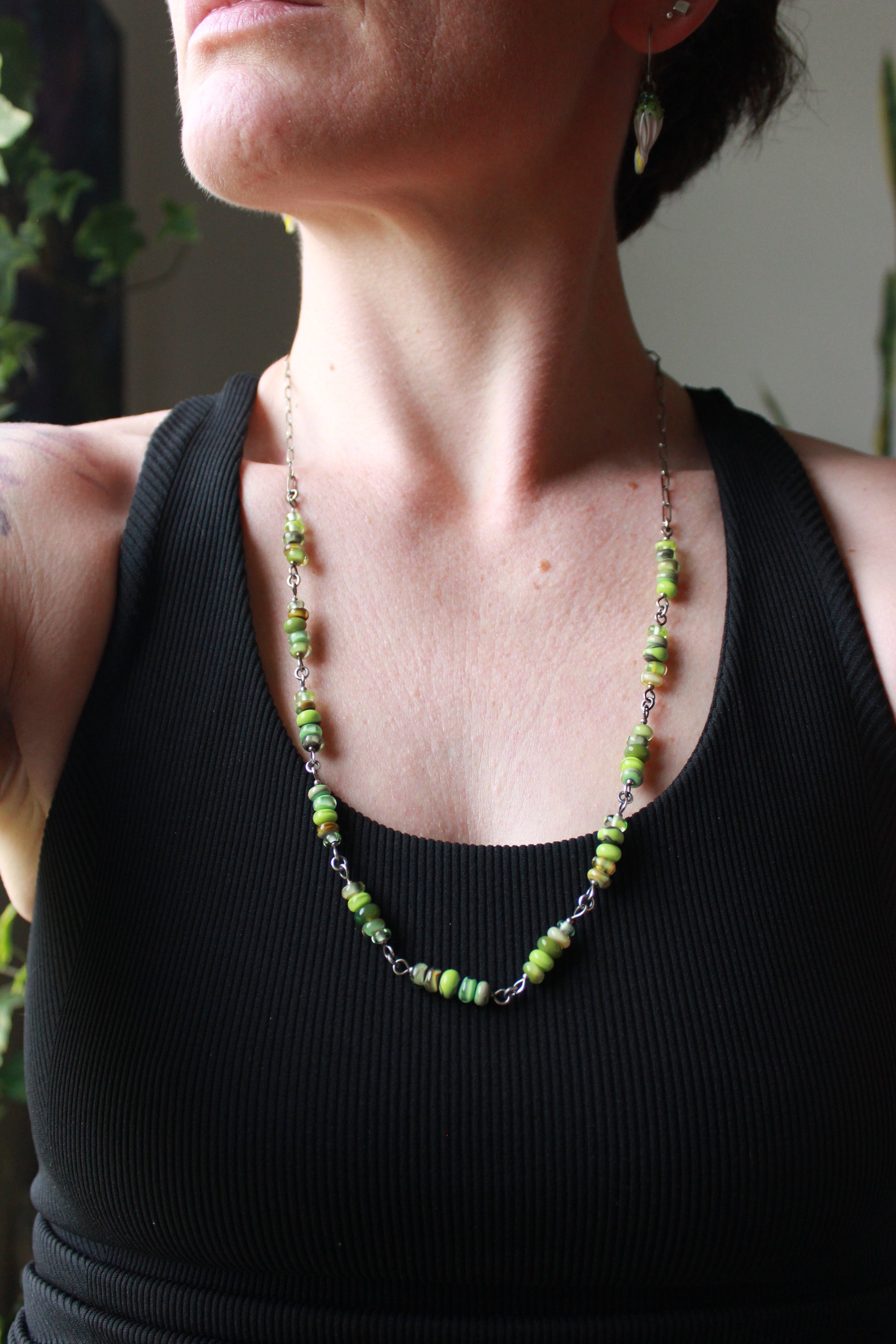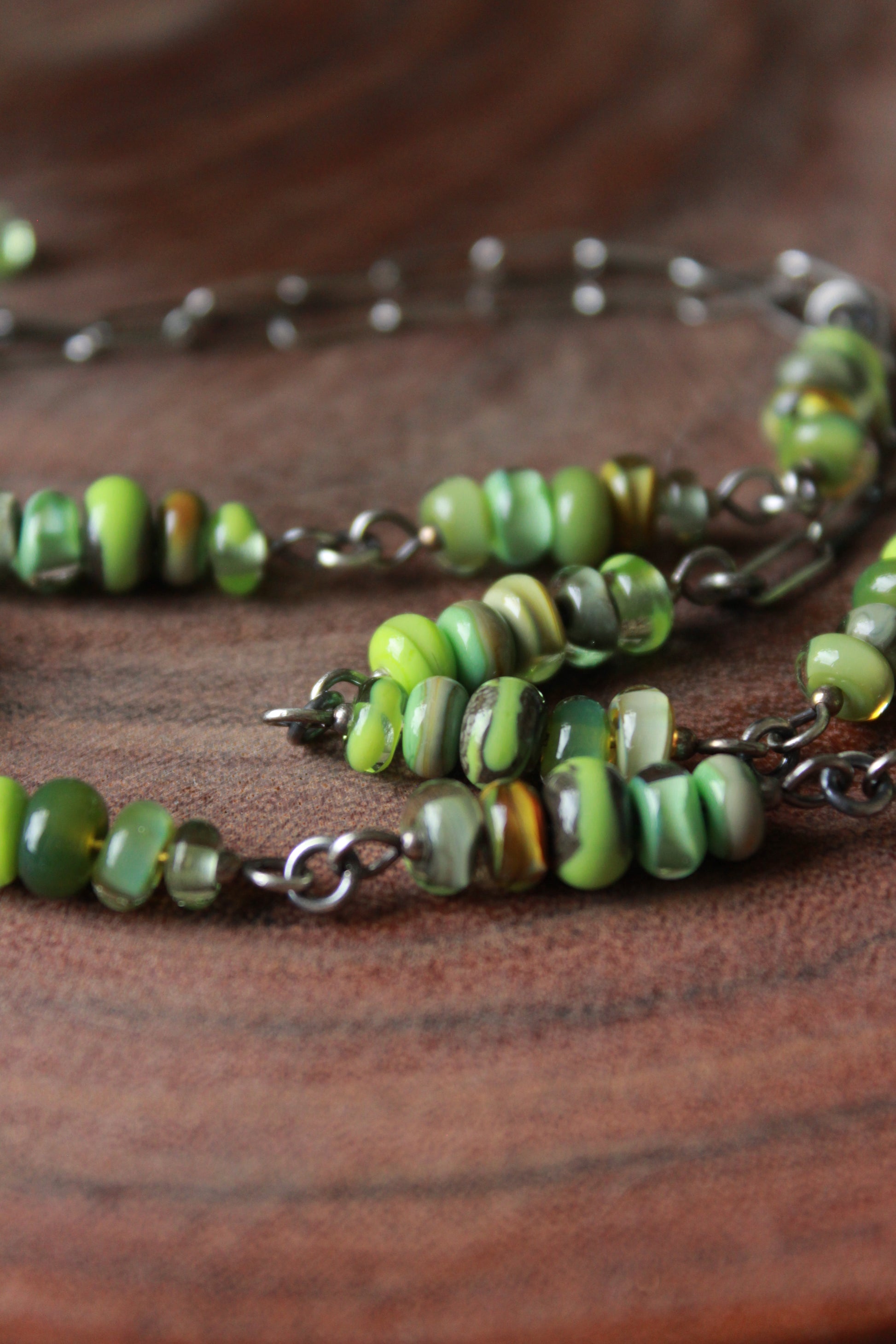 Handmade Moretti glass beads, kiln hardened for durability. All findings are Sterling silver and the chain is finished with a handmade Sterling clasp.