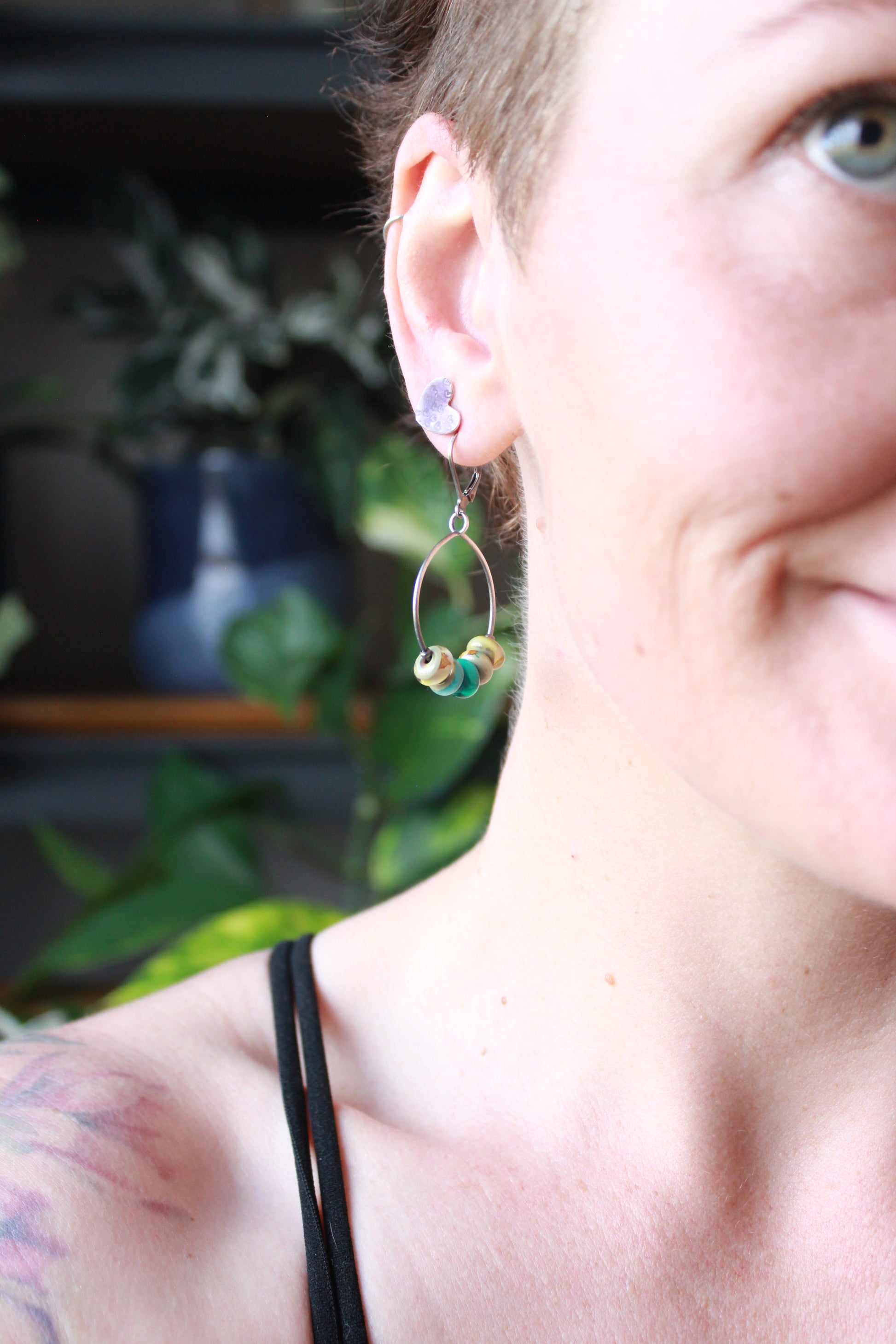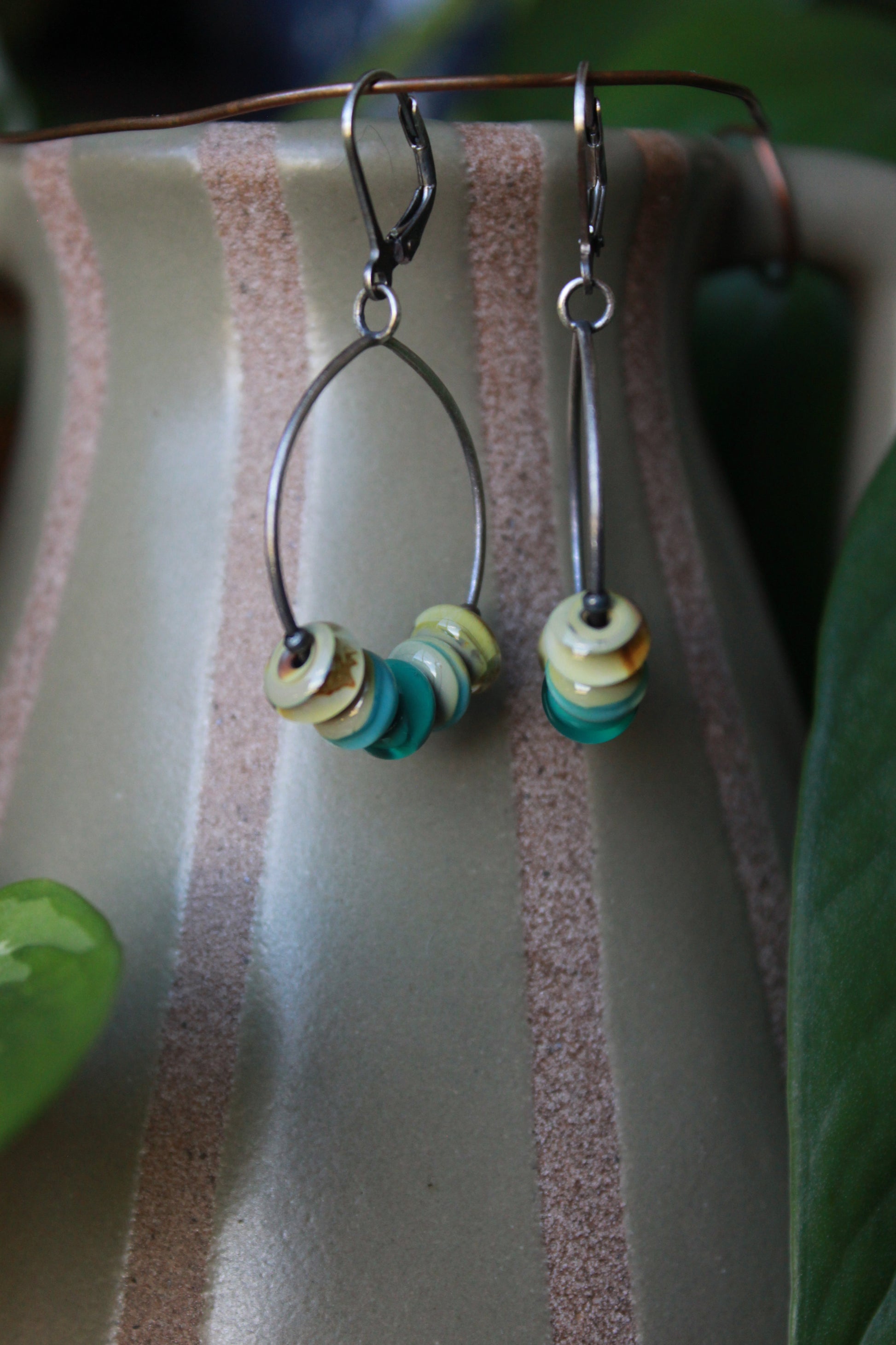 The glass beads go from flame to electronic kiln and are hardened for durability. This pair is finished with sterling silver continental clips - I am always happy to upgrade these to gold filled or make a custom pair of wrapped wire ones if desired.