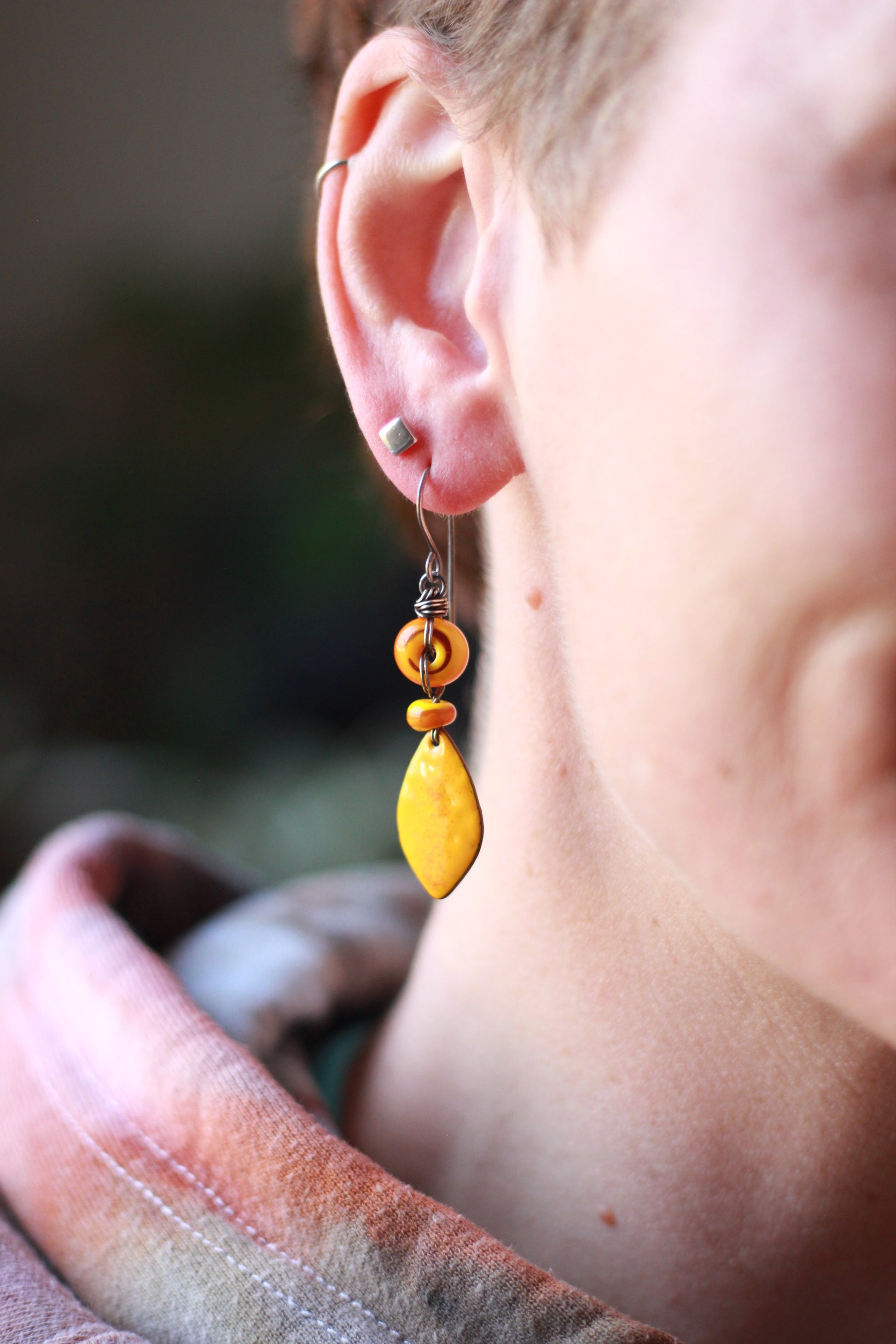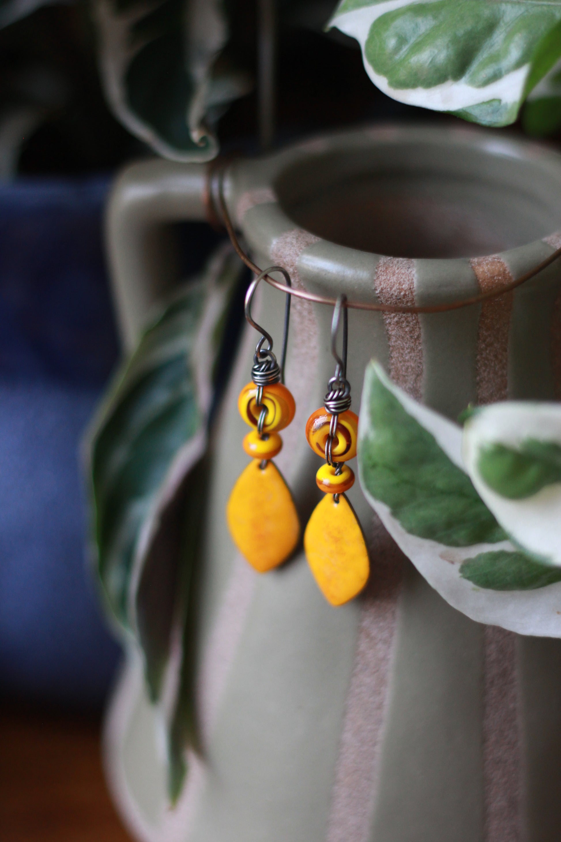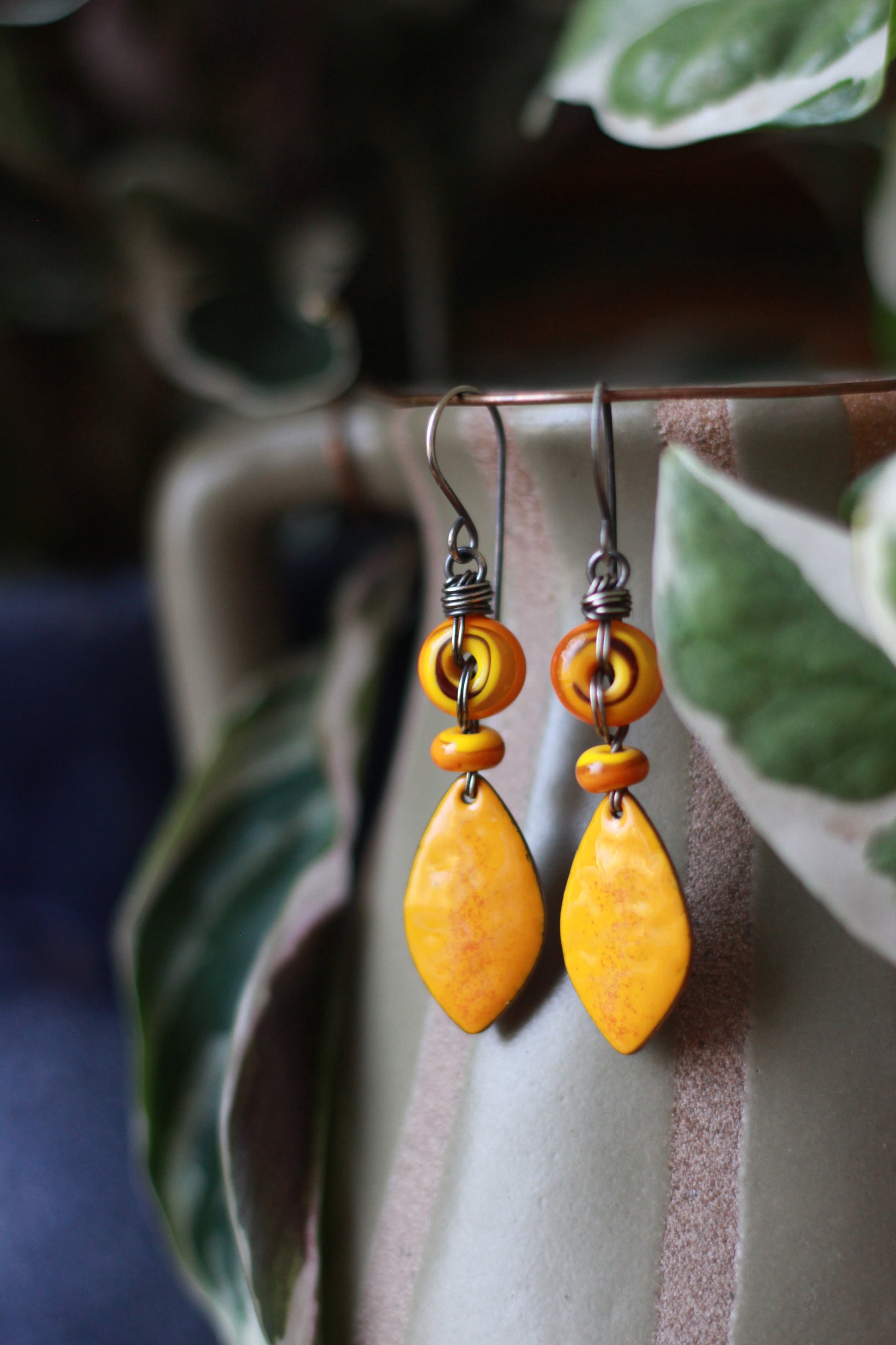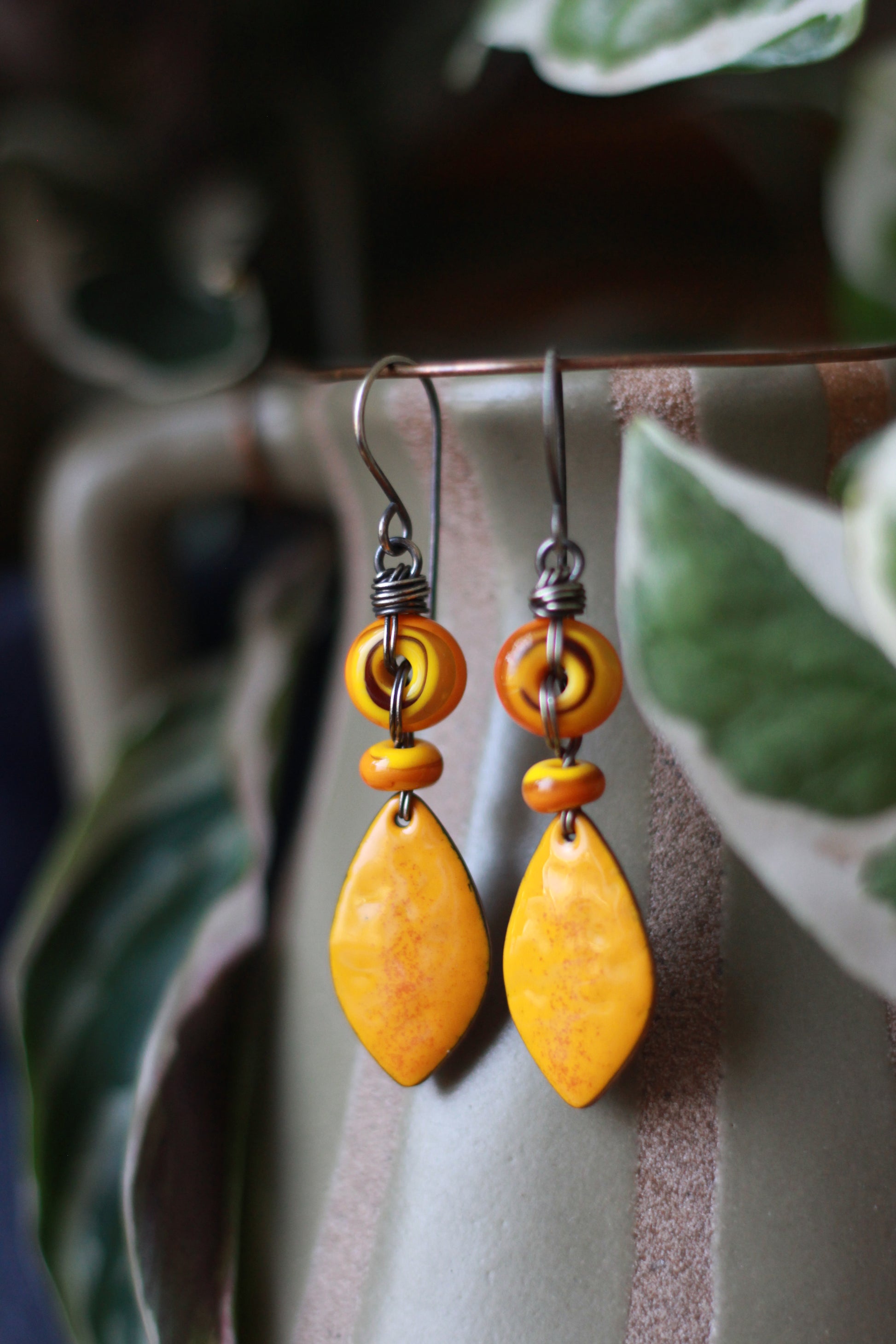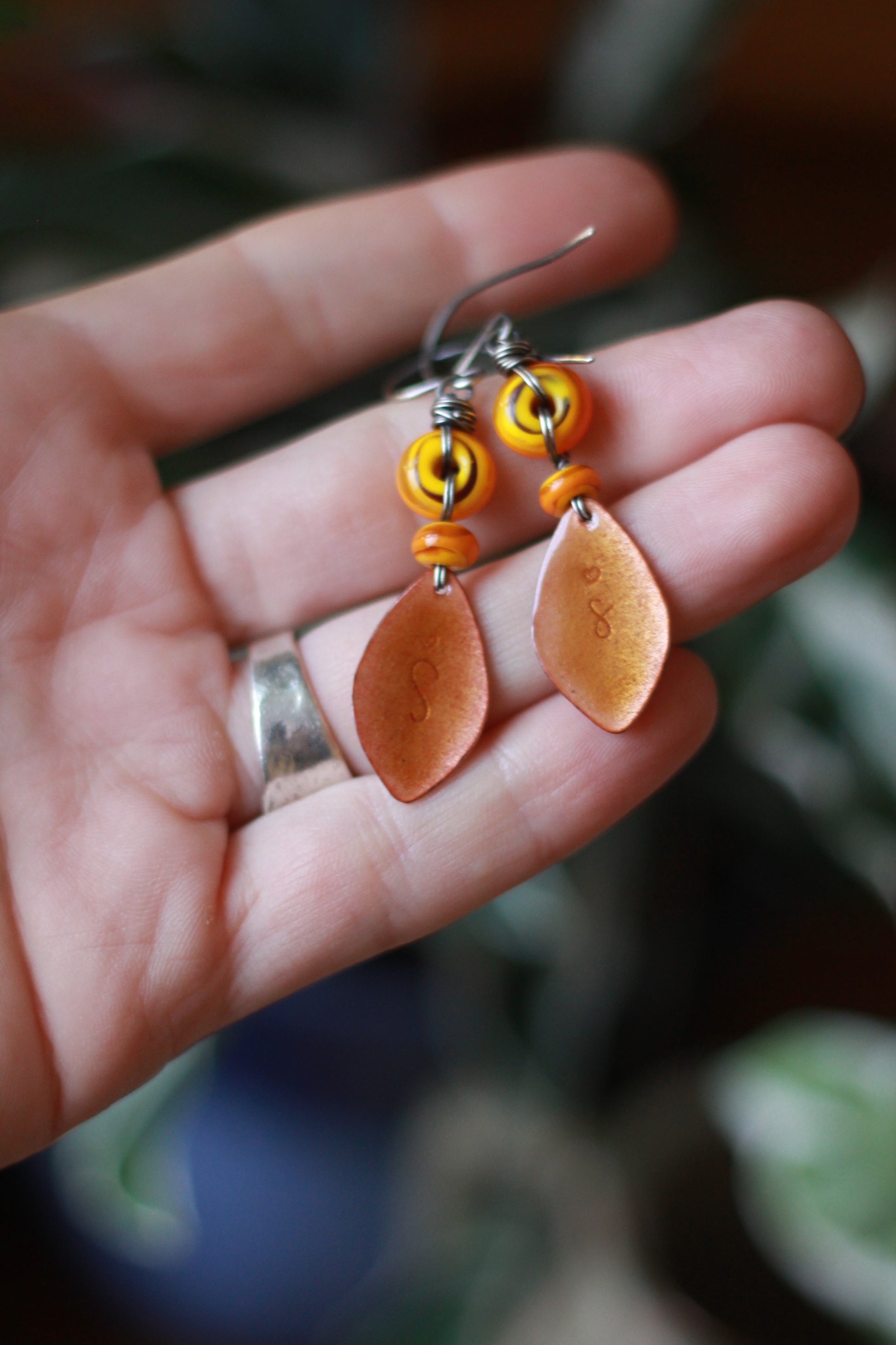 Each element has been sawed, hammered and shaped using traditional metalsmithing techniques. The glass beads are kiln hardened after production for durability.