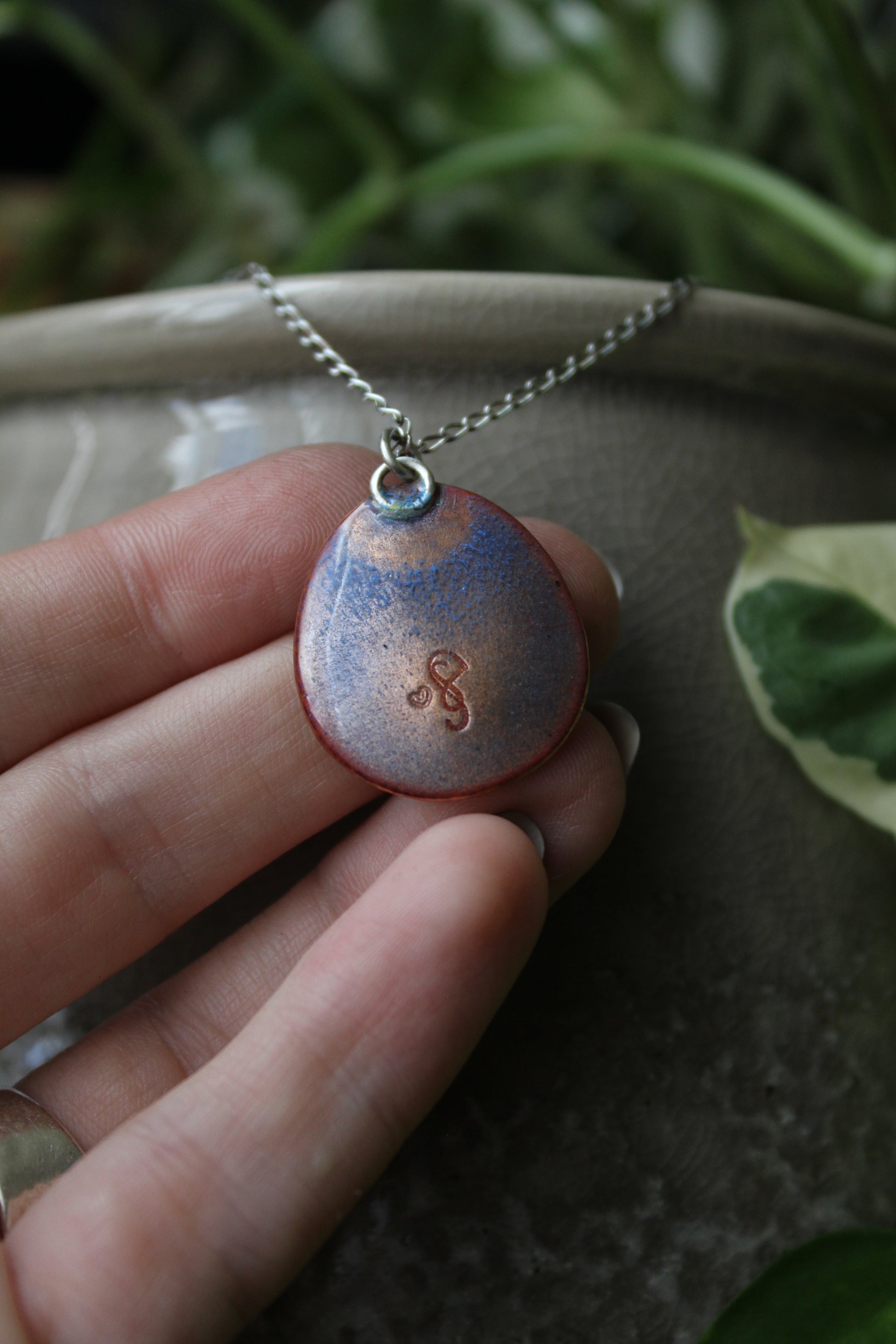 This piece is lightly domed and enamelled on both sides. Enamelling the back adds stability to the piece and means no bare copper will touch your skin.