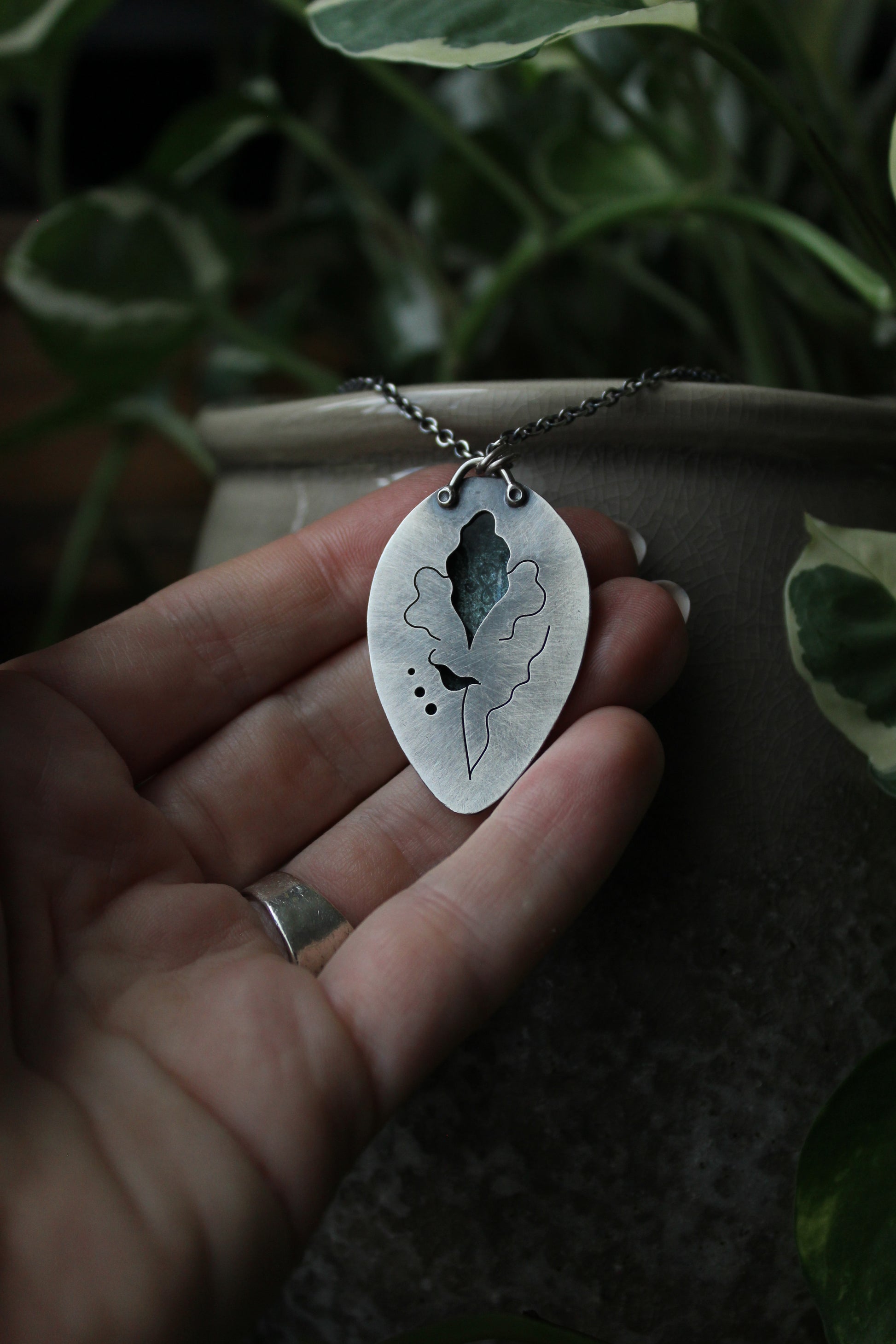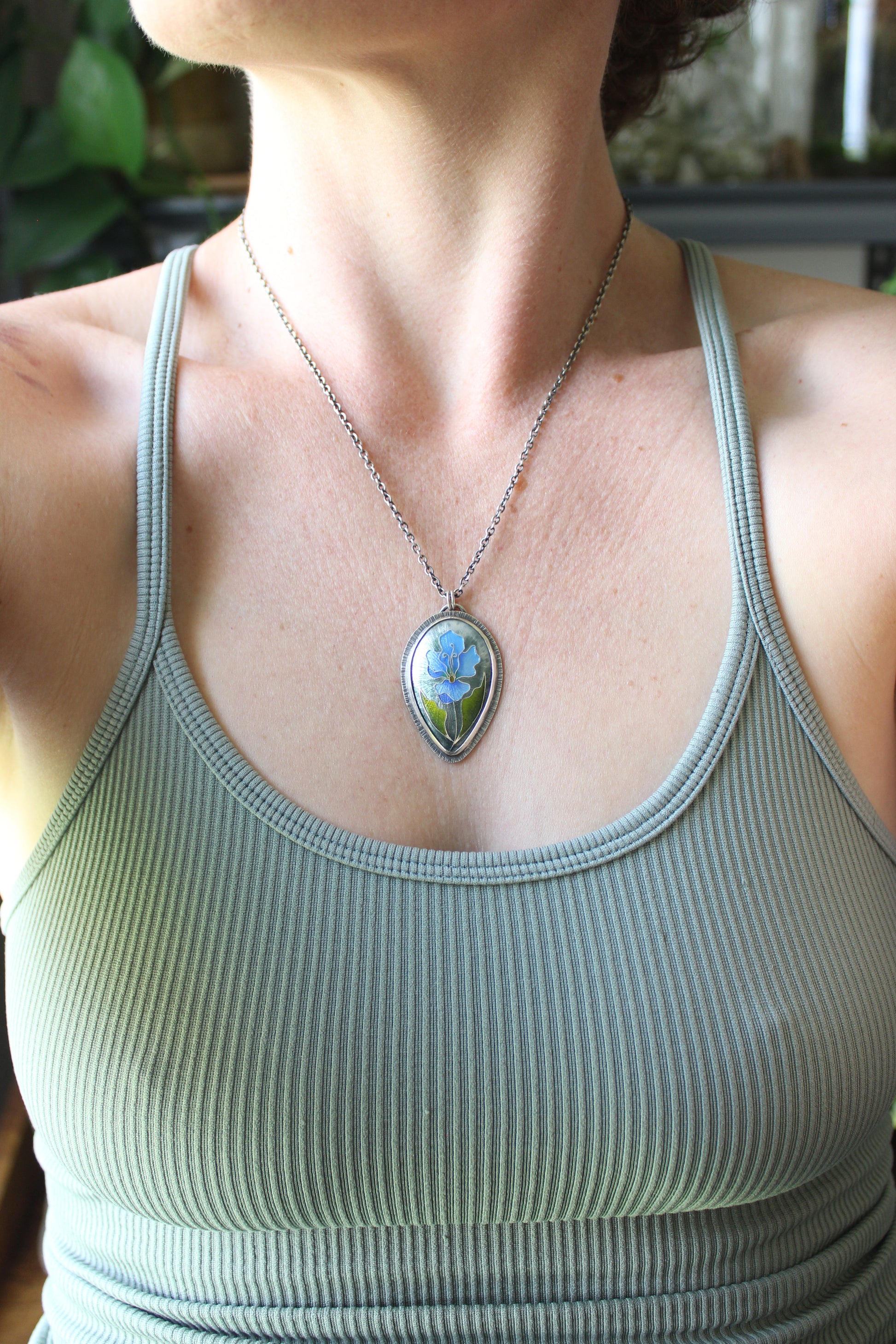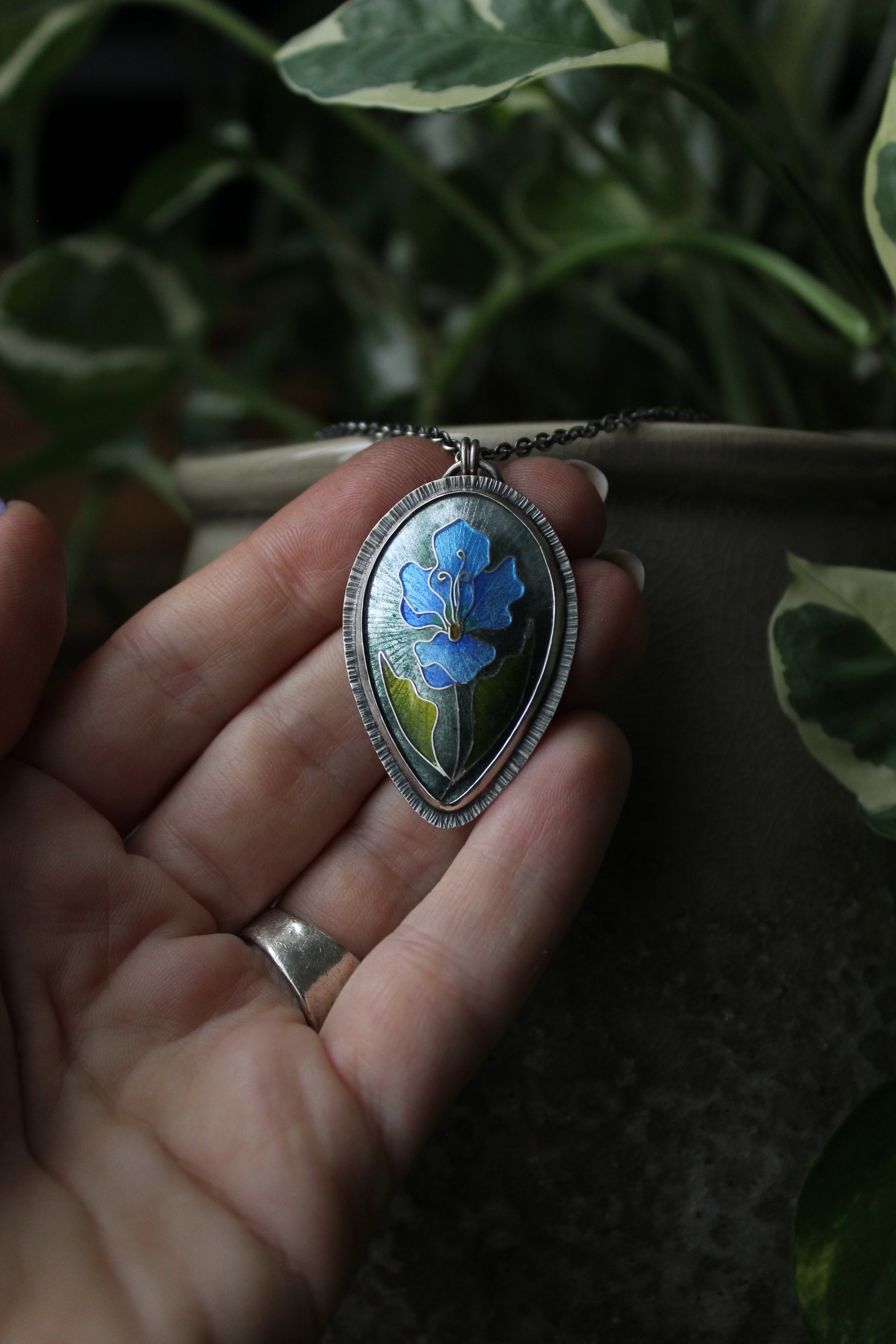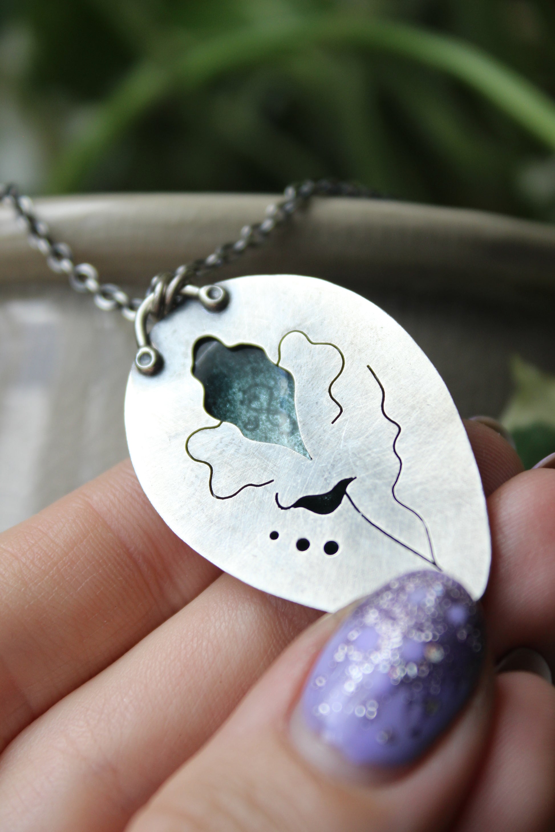 Enamel on silver cloisonné set in a fine and sterling silver bezel setting. The back features a cut outs and my logo is stamped directing into the silver below the vitreous glass on the back of the pendant.